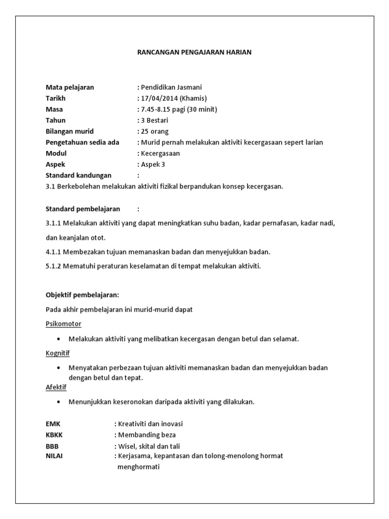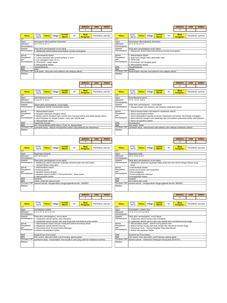 Rph Pendidikan Jasmani Pj Tahun 3 Kssr Rancangan Mengajar Harian